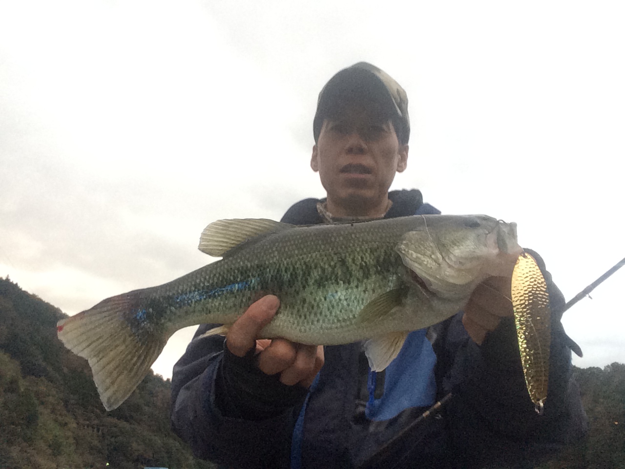 ワサビーに変えて数か所回ると立ち木からロケットが!1100gの初バスをキャッチ!